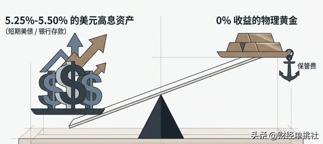 黄金本身是不产生任何利息的资产。你把一公斤黄金放在保险柜里十年,它依然是一公斤,不会多出一分钱。但是,当美联储把利率提高到5.25%-5.50%以后,大型资金只要把美元存进银行或者购买短期美国国债,每年就能获得5%以上的高利率回报。