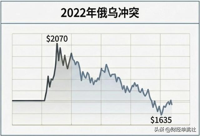我们先来看一个最典型、也是离我们最近的案例:2022年爆发的俄乌冲突。2022年2月24日,战火正式点燃。在开战的最初几个小时和随后的几天里,全球金融市场确实陷入了巨大的恐慌,无数相信“大炮一响黄金万两”的普通散户疯狂涌入黄金市场,硬生生把国际金价在3月上旬推高到了每盎司2070美元附近,逼近历史高点。那个时候,黄金迅速成为市场避险情绪的焦点。