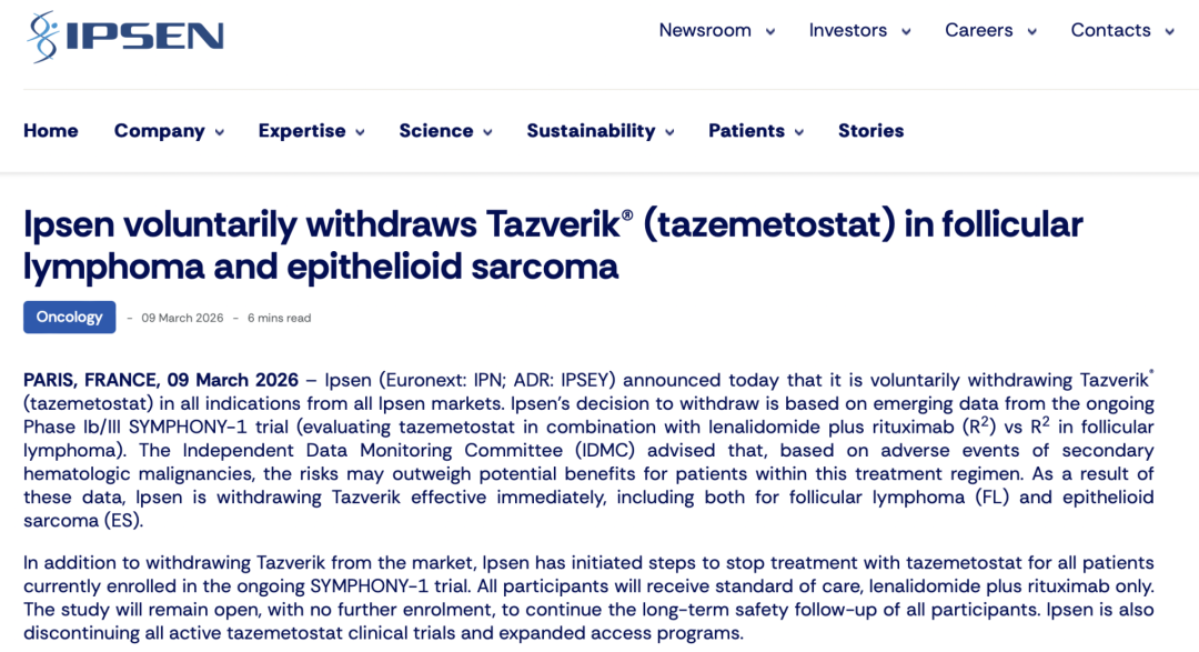 3月9日,益普生宣布正在与美国食品药品监督管理局(FDA)合作推进氢溴酸他泽司他片的撤市,包括滤泡性淋巴瘤(FL)、上皮样肉瘤(ES)两项适应症。