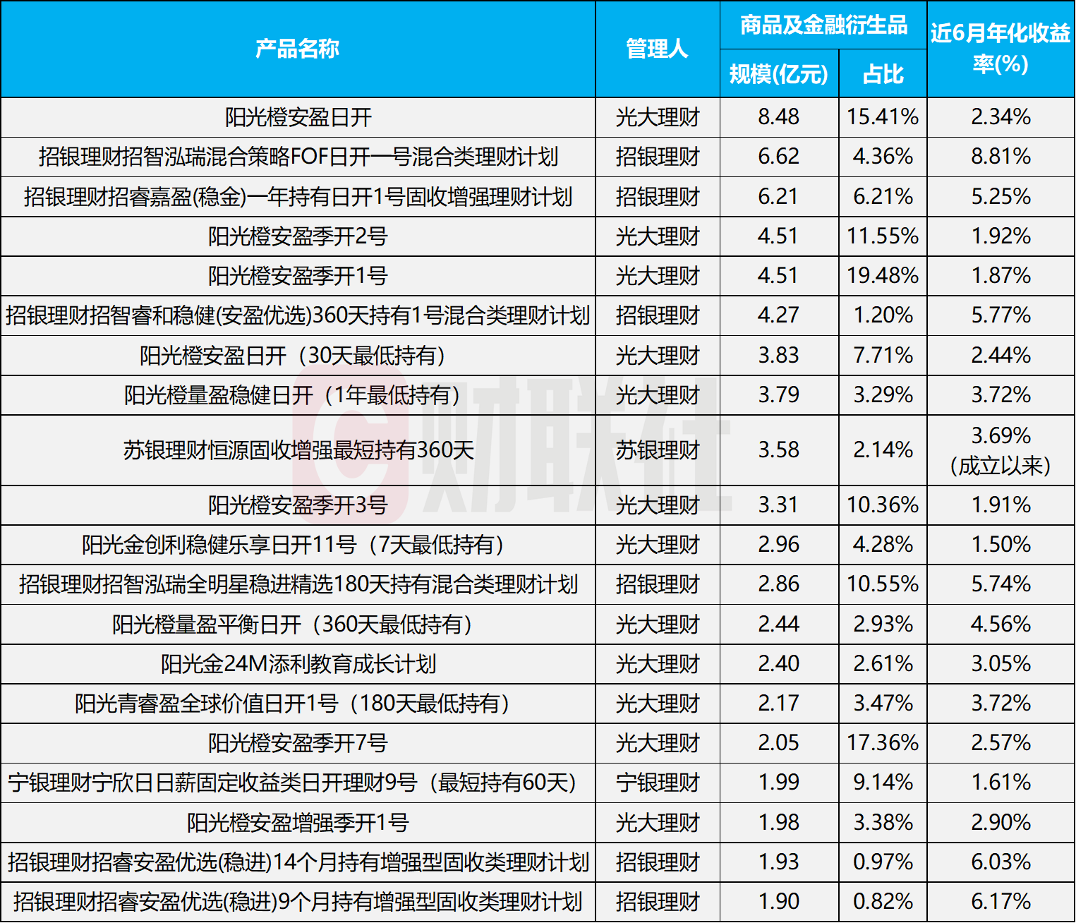 从管理人来看,光大理财和招银理财上榜产品数量最多,宁银理财和苏银理财亦有1只产品上榜。其中,光大理财的“阳光橙安盈”系列(如日开、季开)投资商品及衍生品的规模普遍较高,多只产品投资规模超过3亿元,占比也处于高位(部分超过15%,最高达19.48%)。